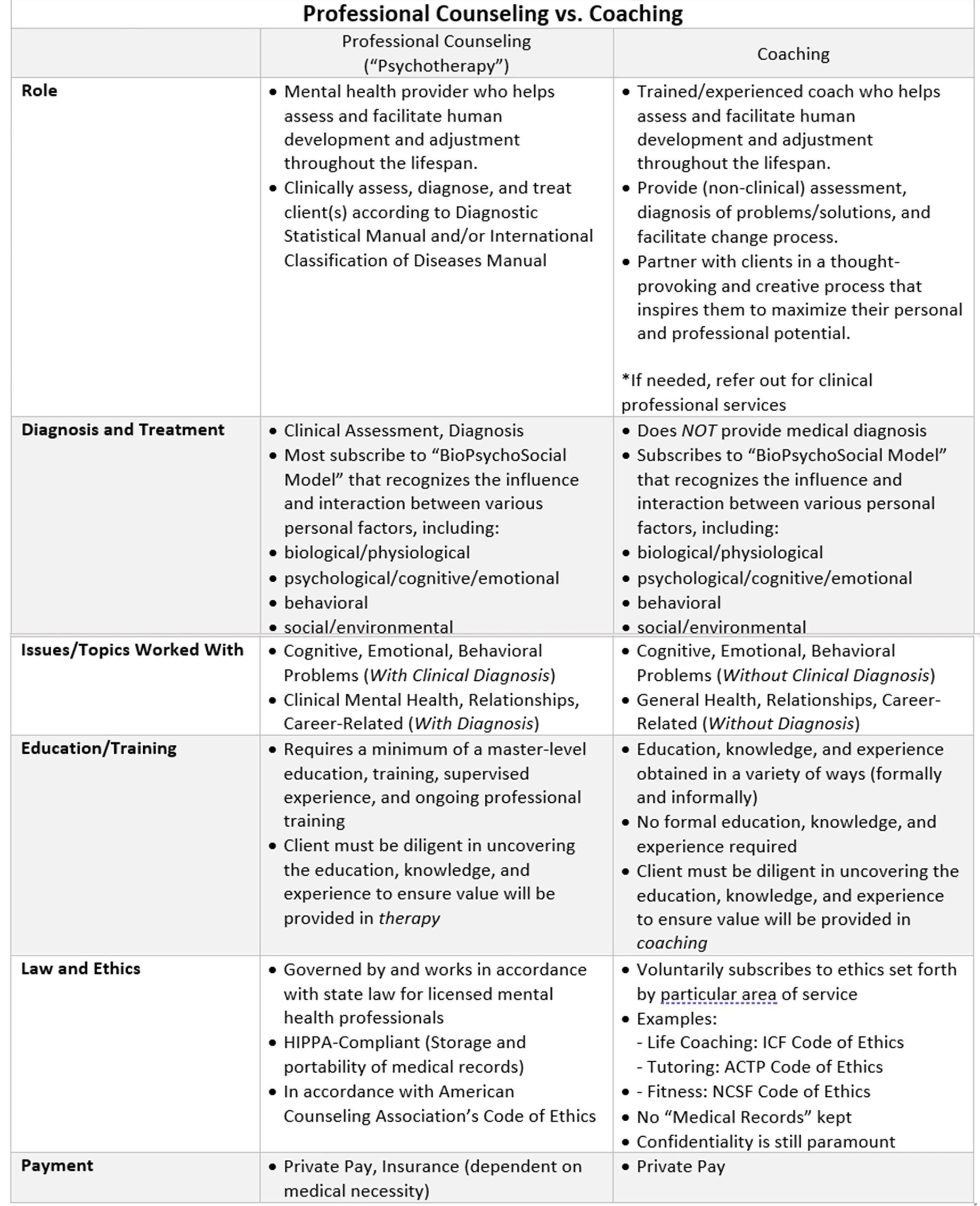 Coaching is different from psychotherapy — it neither is, nor purports to be, a substitute for psychotherapy. The primary differences between coaching and counseling (“psychotherapy”) are that psychotherapy is a healthcare/medical service that usually involves a health/medical diagnosis from a state-licensed mental health professional. This is not true for coaching. You will not receive a medical/health diagnosis. Licensed mental health providers are regulated by state law and by a state board of behavioral health and are required to practice in accordance with these laws and ethics. “Coaching” is not a profession regulated by state law. Although a code of ethics is adopted, a code of ethics is not required to be followed. Counseling will result in formal medical records, subject to rules of HIPPA, while coaching will not include medical records.